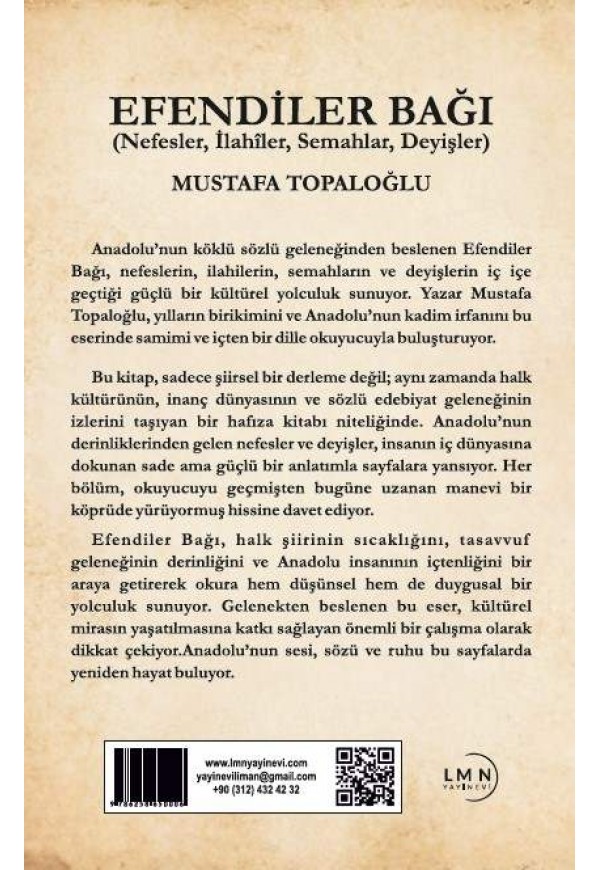 Efendiler Bağı, halk şiirinin sıcaklığını, tasavvuf geleneğinin derinliğini ve Anadolu insanının içtenliğini bir araya getirerek okura hem düşünsel hem de duygusal bir yolculuk sunuyor. Gelenekten beslenen bu eser, kültürel mirasın yaşatılmasına katkı sağlayan önemli bir çalışma olarak dikkat çekiyor. Anadolu’nun sesi, sözü ve ruhu bu sayfalarda yeniden hayat buluyor.