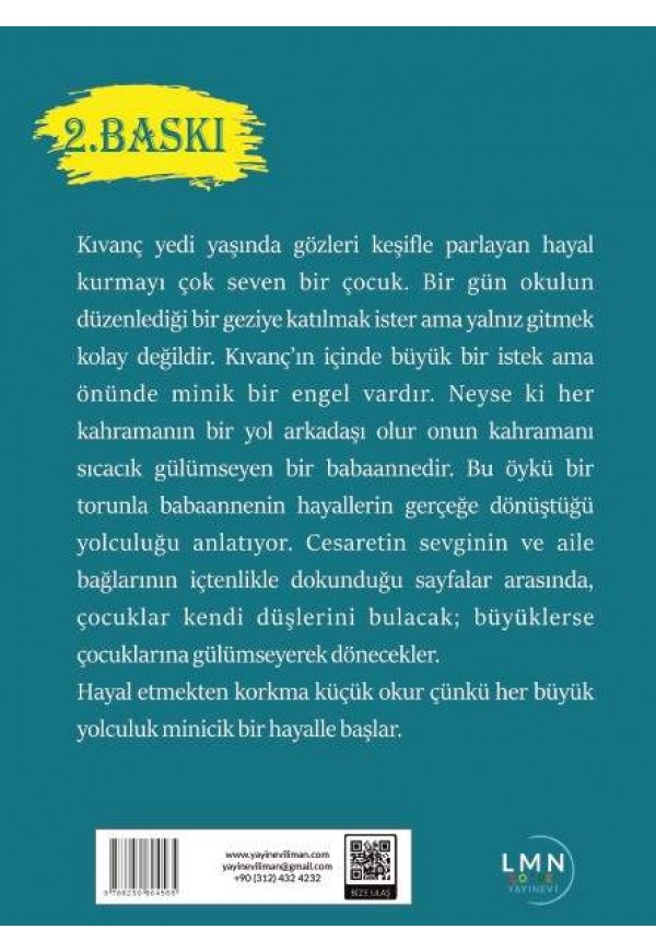 Kıvanç yedi yaşında gözleri keşifle parlayan hayal kurmayı çok seven bir çocuk. Bir gün okulun düzenlediği bir geziye katılmak ister ama yalnız gitmek kolay değildir. Kıvanç’ın içinde büyük bir istek ama önünde minik bir engel vardır. Neyse ki her kahramanın bir yol arkadaşı olur onun kahramanı sıcacık gülümseyen bir babaannedir. Bu öykü bir torunla babaannenin hayallerin gerçeğe dönüştüğü yolculuğu anlatıyor. Cesaretin sevginin ve aile bağlarının içtenlikle dokunduğu sayfalar arasında, çocuklar kendi düşlerini bulacak; büyüklerse çocuklarına gülümseyerek dönecekler. Hayal etmekten korkma küçük okur çünkü her büyük yolculuk minicik bir hayalle başlar.
